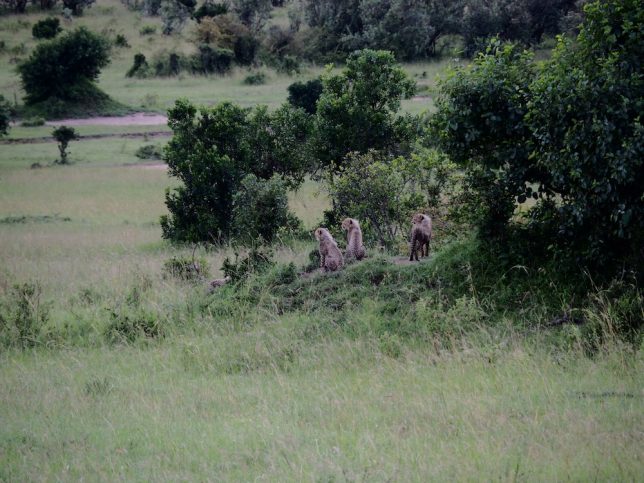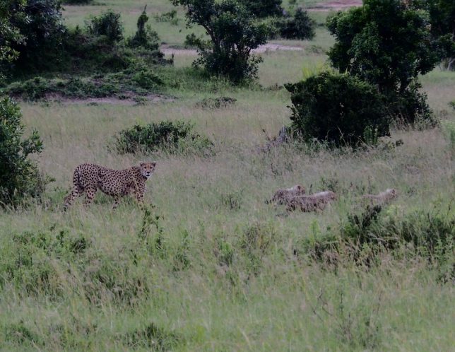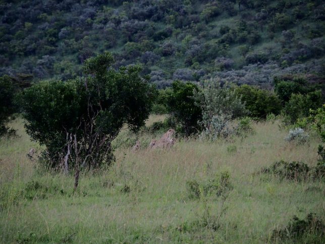 その場に着くと、数台のバンがジーっと奥を見ている。なんと、チーターのファミリーがいます。お母さんと4匹の子供達。